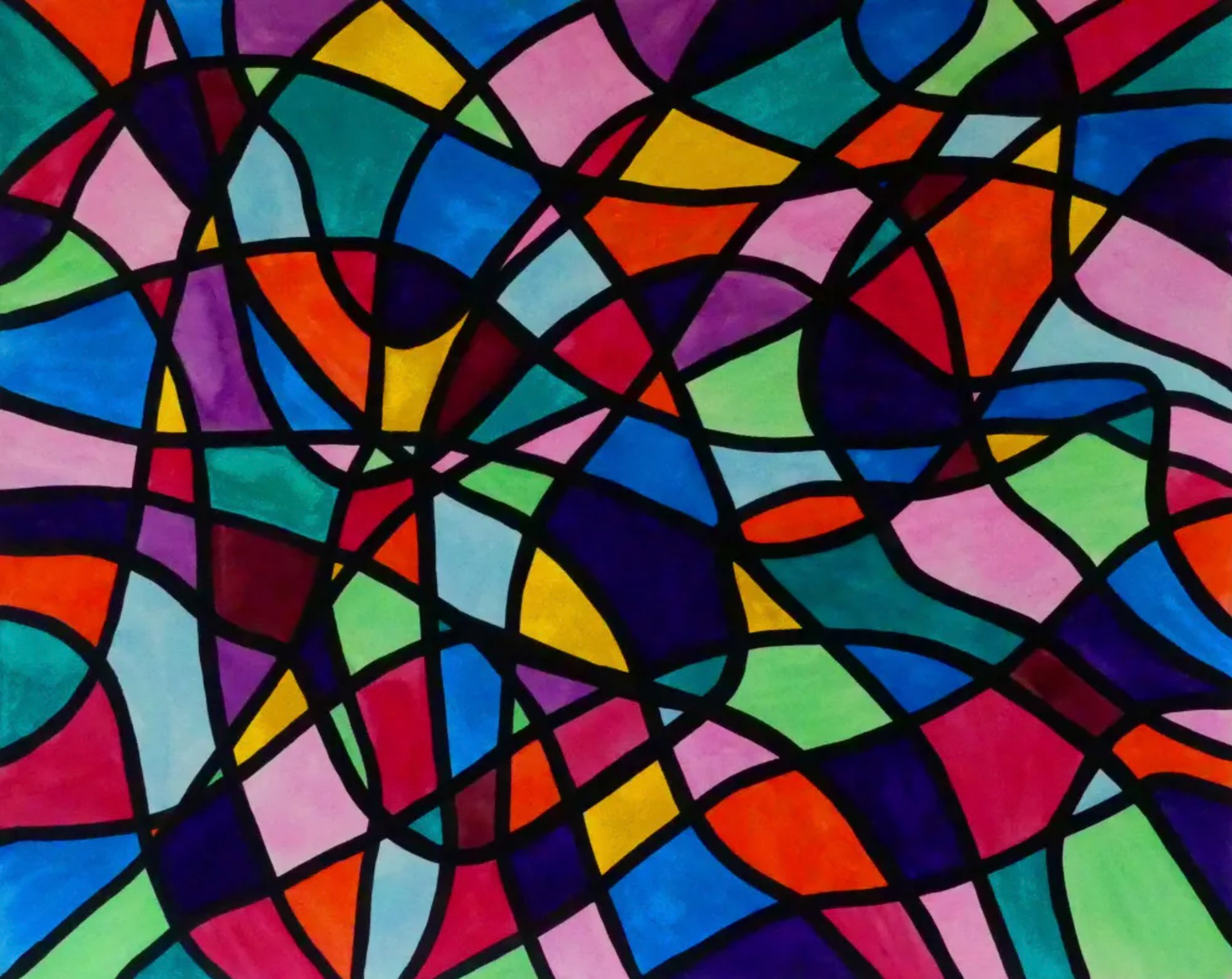 "When my right hand grasps a paint brush it seems to take a mind of its own. It illustrates the illusionary aerial view from the obscured glimpse from the plane window. The brush cascades across the paper in an agile manner. The vivid colors harmonize together in free form borders and my eye dances down the lines like a parade following an unconventional route." — Kameo Chambers